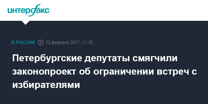 Москва. 22 февраля. INTERFAX.RU - Законодательное собрание Санкт-Петербурга уточнило законопроект, запрещающий встречи с избирателями в форме митингов, передал корреспондент "Интерфакса" в среду. Инициативу поддержали 39 депутатов, законопроект был принят в целом.