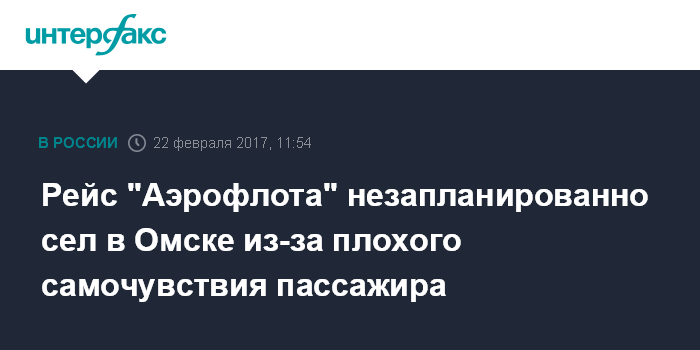 Москва. 22 февраля. INTERFAX.RU - Самолет авиакомпании "Аэрофлот" совершил незапланированную посадку в аэропорту "Омск-Центральный", поскольку одному из пассажиров потребовалась помощь врачей, сообщила "Интерфаксу" ведущий специалист по внутрикорпоративным коммуникациям аэропорта Галина Гавриш.