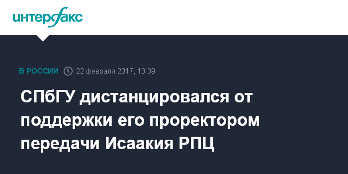 Москва. 22 февраля. INTERFAX.RU - Первый проректор Санкт-Петербургского государственного университета Илья Дементьев, подписавший обращение к губернатору города Георгию Полтавченко с просьбой ускорить передачу Исаакиевского собора Русской православной церкви, заявил, что высказанное им мнение не является позицией вуза.