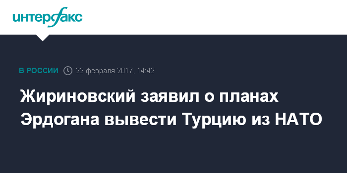 Москва. 22 февраля. INTERFAX.RU - Лидер ЛДПР и ее фракции в Госдуме Владимир Жириновский утверждает, что президент Турции Реджеп Тайип Эрдоган заявил ему, что Анкара в будущем собирается выйти из НАТО.