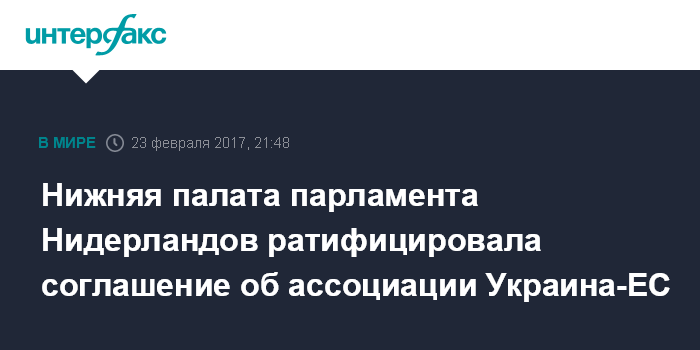 Москва. 23 февраля. INTERFAX.RU - На заседании в четверг нижняя палата парламента Нидерландов (Палата представителей) официально подтвердила ратификацию соглашения об ассоциации с Украиной, пишет "Европейская правда".