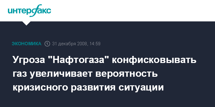 Москва. 31 декабря. INTERFAX.RU - Письмо главы правления НАК "Нафтогаз Украины" Олега Дубины с угрозой начать конфискацию российского газа увеличивает вероятность кризисного развития ситуации.