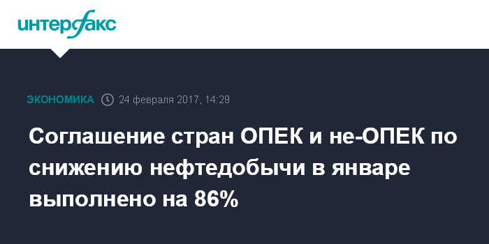 Москва. 24 февраля. INTERFAX.RU - Договоренности по сокращению нефтедобычи странами ОПЕК и не-ОПЕК в январе выполнены на 86%, говорится в релизе картеля по итогам заседания технического комитета по мониторингу выполнения договоренностей.