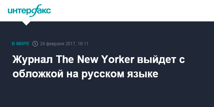 Москва. 24 февраля. INTERFAX.RU - Американский журнал The New Yorker подготовил "русский" номер, который будет выпущен на следующей неделе. На его обложке название издания будет написано кириллицей ("The Нью-Йоркер"), а изображен на ней будет российский президент.