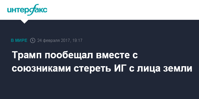 Москва. 24 февраля. INTERFAX.RU - Президент США Дональд Трамп пообещал уничтожить "Исламское государство" (ИГ - террористическая организация, запрещенная в России).
