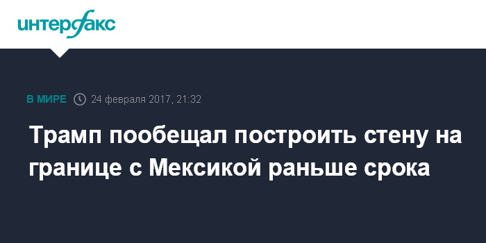 Москва. 24 февраля. INTERFAX.RU - Президент США Дональд Трамп пообещал начать строительство стены на границе с Мексикой раньше срока, то есть до 2019 года, сообщает в субботу Politico.