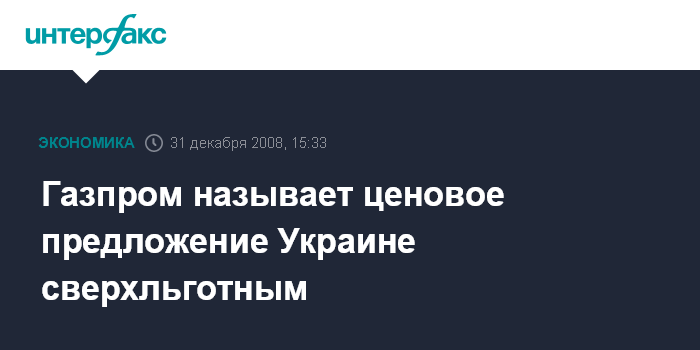 Москва. 31 декабря. INTERFAX.RU - "Газпром" сделал Украине "сверхльготное" предложение по цене на газ в 2009 г., однако украинская сторона до сих по его не приняла, заявил журналистам в среду зампред правления "Газпрома" Александр Медведев.