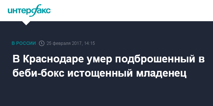 Москва. 25 февраля. INTERFAX.RU - В Краснодаре следователи проводят проверку в связи со смертью ребенка, которого обнаружили в беби-боксе с признаками истощения, сообщили "Интерфаксу" в пресс-службе Следственного комитета России в субботу.