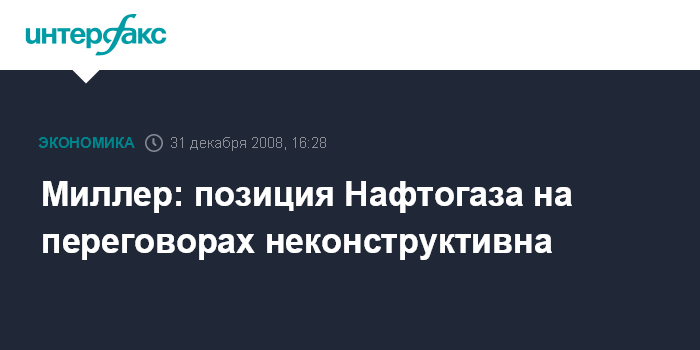 Кроме того, в заявлении, показанном телеканалом НТВ, Миллер назвал позицию украинской стороны на переговорах неконструктивной. Он подтвердил, что если договоренность с Украиной не будет достигнута к полуночи, то к 10:00 мск первого января у Газпрома не будет оснований для поставок газа этой стране.