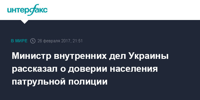 Москва. 26 февраля. INTERFAX.RU - Министр внутренних дел Украины Арсен Аваков рассчитывает на достижение уровня доверия общества к Национальной полиции в 50% за 3-5 лет.