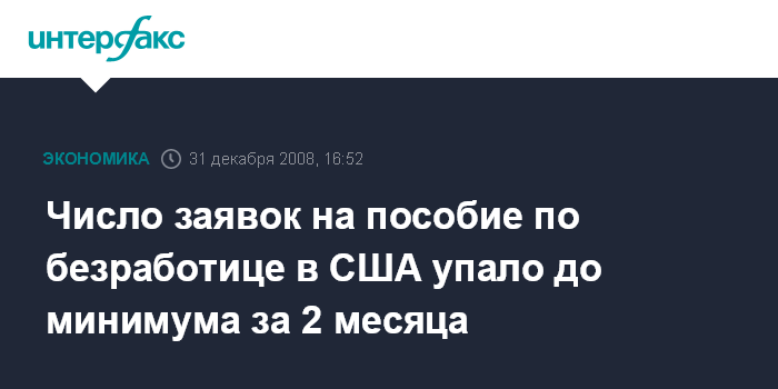Москва. 31 декабря. INTERFAX.RU - Число американцев, впервые обратившихся за пособием по безработице, на прошлой неделе упало на 94 тыс., до 492 тыс. - минимума за два месяца, сообщило агентство Bloomberg со ссылкой на данные министерства труда.