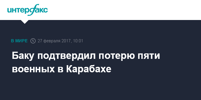 Москва. 27 февраля. INTERFAX.RU - В Министерстве обороны Азербайджана заявили, что армянская сторона нарушила договоренности об эвакуации тел пяти азербайджанских военнослужащих, погибших в результате боестолкновений в ночь на 25 февраля в зоне карабахского конфликта.