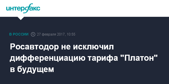 Москва. 27 февраля. INTERFAX.RU - Глава Росавтодора Роман Старовойт не исключает возможности дифференциации тарифа в системе взимания платы с грузовиков "Платон" по завершению ее развертывания в полном объеме.