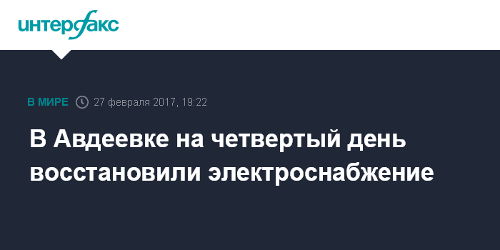 Москва. 27 февраля. INTERFAX.RU - В Авдеевке по состоянию на 17:00 понедельника возобновлено электроснабжение, прерванное из-за обстрелов еще 24 февраля.