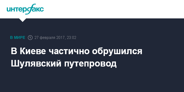 Москва. 27 февраля. INTERFAX.RU - Мост на Шулявском путепроводе в Киеве, связывающий проспект Вадима Гетьмана и улицу Александра Довженко и проходящий над проспектом Победы, частично обрушился в понедельник вечером.