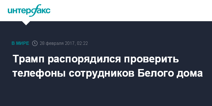 Москва. 28 февраля. INTERFAX.RU - Президент США Дональд Трамп отдал распоряжение пресс-секретарю Белого дома Шону Спайсеру изучить телефоны администрации в поисках утечек секретных данных в СМИ, передает в понедельник телеканал CNN со ссылкой на источники.