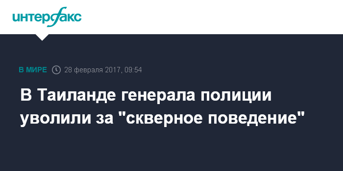 Москва. 28 февраля. INTERFAX.RU - Высокопоставленный чиновник уволен в Таиланде из-за неподобающего поведения, сообщают во вторник западные СМИ со ссылкой на заявление правительства.