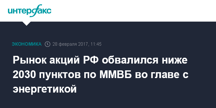 Москва. 28 февраля. INTERFAX.RU - Рынок акций РФ утром во вторник обвалился ниже 2030 пунктов по индексу ММВБ (минимум с 17 ноября) на фоне распродаж активов нерезидентами и сработавших сигналах stop-loss; лидерами отката выступают бумаги энергетических компаний, также обвалившихся к уровням осени прошлого года.