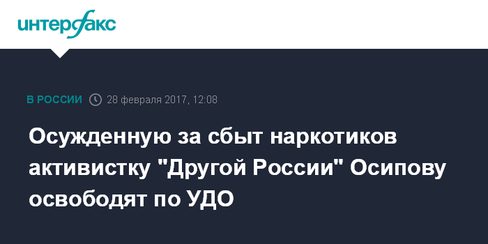 Москва. 28 февраля. INTERFAX.RU - Активистка "Другой России" Таисия Осипова, осужденная на восемь лет за покушение на сбыт наркотиков, во вторник досрочно покинет исправительную колонию, сообщила ее адвокат Светлана Сидоркина.