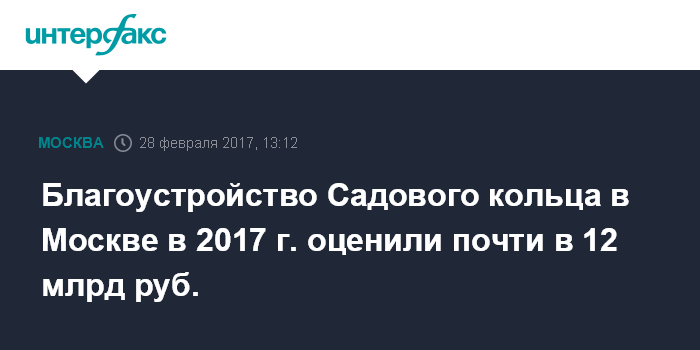 Москва. 28 февраля. INTERFAX.RU - Благоустройство Садового кольца в Москве , которое должно завершиться до конца 2017 года, суммарно оценено в 11,58 млрд рублей. Это следует из условий технического задания на портале госзакупок.