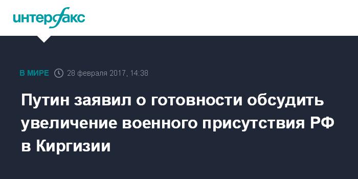 Москва. 28 февраля. INTERFAX.RU - Россия готова обсудить вопрос об увеличении военного присутствия в Киргизии, если этого захочет Бишкек, заявил президент РФ Владимир Путин.