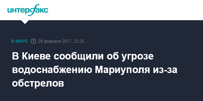 Москва. 28 февраля. INTERFAX.RU - Во вторник примерно в 17:20 начался обстрел насосной станции первого подъема Юго-Донбасского водовода вблизи населенного пункта Васильевка Донецкой области, что угрожает водоснабжению Мариуполя и ряда районов области, заявляют в министерстве по временно оккупированным территориям Украины.