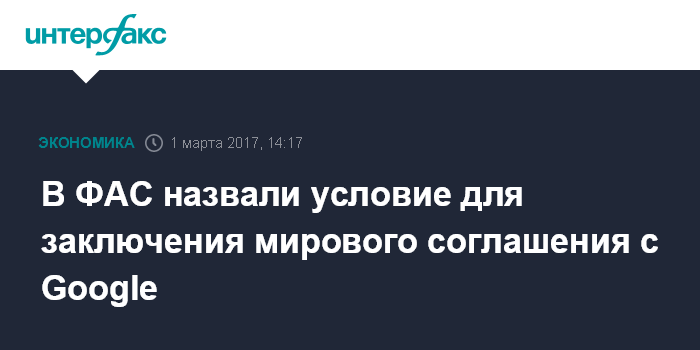 Москва. 1 марта. INTERFAX.RU - Федеральная антимонопольная служба готова заключить мировое соглашение с Google при условии выполнения корпорацией предписания службы, сообщил журналистам руководитель ФАС Игорь Артемьев.