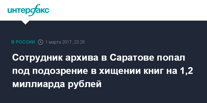 Москва. 1 марта. INTERFAX.RU - В Саратове завершено расследование уголовного дела 27-летнего сотрудника архива, обвиняемого в хищении книг 19 века, стоимость которых оценивается более чем в 1,2 млрд рублей, сообщила официальный представитель МВД России Ирина Волк.