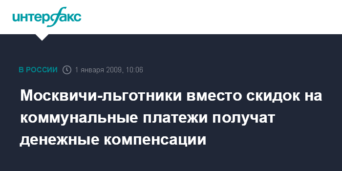 Москва. 1 января. INTERFAX.RU - Московские льготники, получающие скидки по оплате за жилье, коммунальные услуги и связь, начиная с 2009 года вместо них будут получать выплаты, компенсирующие их расходы, сообщили "Интерфаксу" в городской администрации.