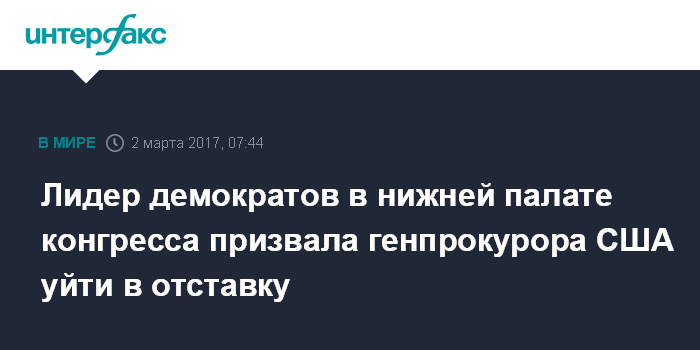 Москва. 2 марта. INTERFAX.RU - Лидер фракции меньшинства в Палате представителей Конгресса США Нэнси Пелоси призвала генпрокурора Джеффа Сешнса покинуть свой пост в связи с сообщениями о том, что он не смог предоставить информацию о своих контактах с российским правительством, отвечая на вопросы в ходе слушаний по утверждению его кандидатуры в Сенате.
