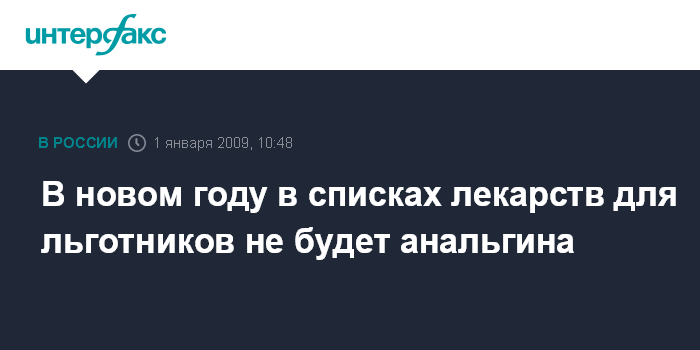 Москва. 1 января. INTERFAX.RU - Анальгин с 1 января 2009 года изъят из списка лекарственных препаратов, предназначенных для льготников, сообщила директор департамента Минздравсоцразвития РФ Диана Михайлова.
