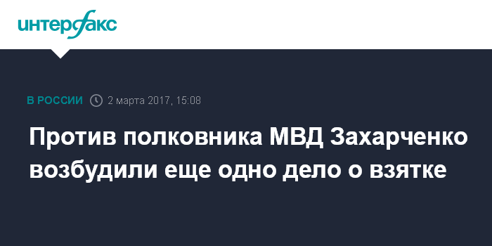 Москва. 2 марта. INTERFAX.RU - Следствие возбудило еще одно уголовное дело - о взяточничестве в отношении Дмитрия Захарченко, бывшего врио начальника управления "Т" антикоррупционного главка МВД РФ.