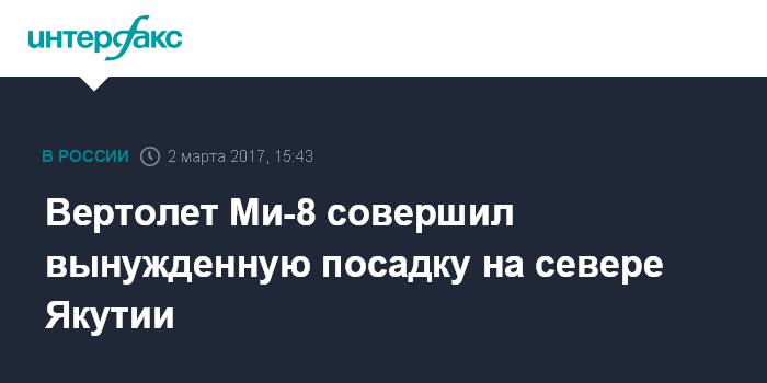 Москва. 2 марта. INTERFAX.RU - Вынужденную посадку совершил вертолет Ми-8, следовавший по маршруту Жиганск - Верхнее Молодо, в Жиганском районе Якутии. Об этом сообщает пресс-служба МЧС республики в четверг.