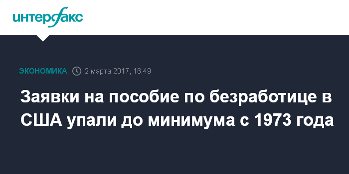 Москва. 2 марта. INTERFAX.RU - Количество американцев, впервые обратившихся за пособием по безработице, на прошлой неделе сократилось на 19 тысяч и составило 223 тысячи, сообщается в отчете министерства труда США. Это минимальный уровень с марта 1973 года. Согласно пересмотренным данным, неделей ранее число заявок составляло 242 тыс., а не 244 тыс., как было объявлено первоначально.