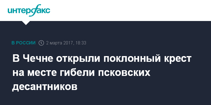 Москва. 2 марта. INTERFAX.RU - Поклонный крест установили в Чечне на месте гибели 84 десантников 6-й роты 76-й десантно-штурмовой дивизии, сообщает пресс-служба администрации Псковской области.