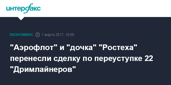Москва. 2 марта. INTERFAX.RU - "Аэрофлот" лизинговая "дочка" "Ростеха" "Авиакапитал-Сервис" перенесли сделку по переуступке прав на 22 "Боинг 787 Дримлайнер" на сентябрь 2017 года, сообщил "Интерфаксу" источник, близкий к совету директоров авиакомпании.