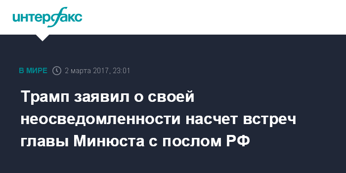 Москва. 2 марта. INTERFAX.RU - Президент США Дональд Трамп заявил, что ему не было известно о контактах главы Минюста США Джеффа Сешнса с послом России в США Сергеем Кисляком.