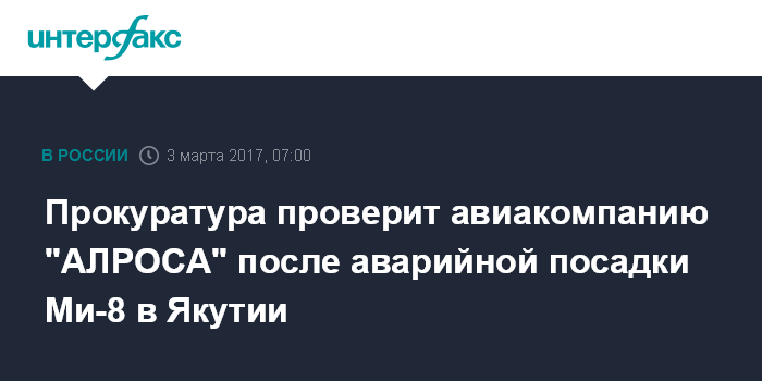 Москва. 3 марта. INTERFAX.RU - Восточно-Сибирская транспортная прокуратура проверит соблюдение требований безопасности полетов в авиакомпании "Алроса" в связи с произошедшей накануне аварийной посадкой вертолета Ми-8 в Жиганском районе Якутии.
