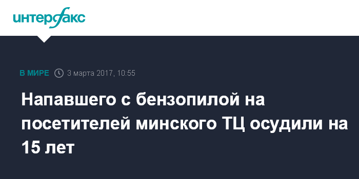 Москва. 3 марта. INTERFAX.RU - Студента минского вуза Владислава Казакевича, устроившего резню бензопилой в минском торговом центре "Новая Европа", приговорили к 15 годам лишения свободы с отбыванием наказания в колонии общего режима, передает корреспондент агентства "Интерфакс-Запад" в пятницу из зала суда.