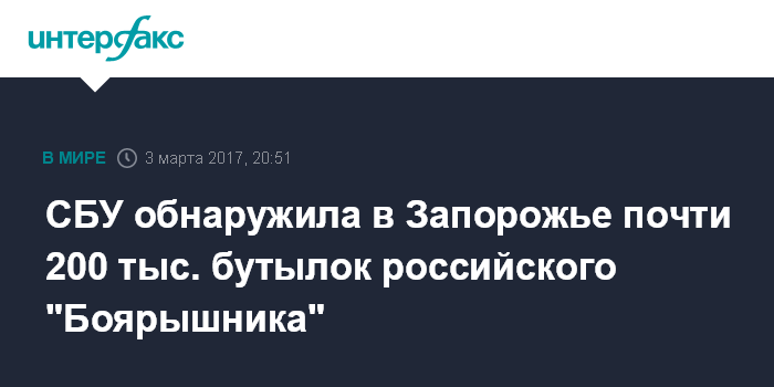 Москва. 3 марта. INTERFAX.RU - Сотрудники Службы безопасности Украины обнаружили в Запорожье около 200 тысяч бутылок спиртосодержащей продукции "Лосьон косметический "Боярышник" российского производства.
