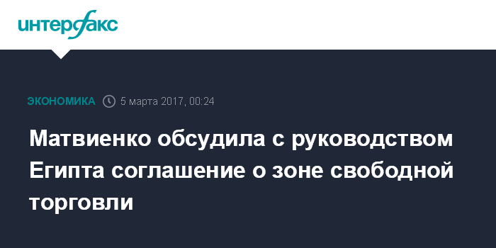 Москва. 5 марта. INTERFAX.RU - Вопрос о соглашении между Евразийским экономическим союзом и Египтом о зоне свободной торговли поднимался на переговорах спикера Совета Федерации Валентины Матвиенко с руководством этой страны в Каире.