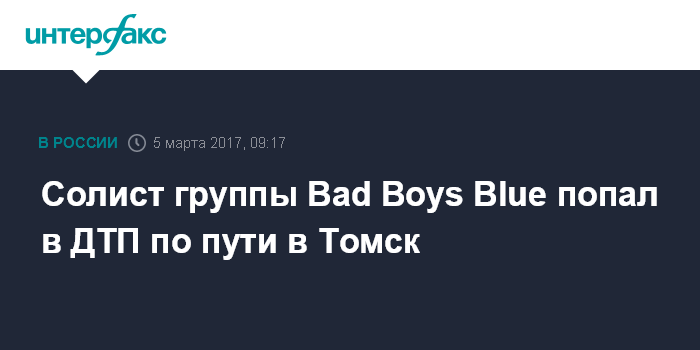 Москва. 5 марта. INTERFAX.RU - Автомобиль, в котором ехал лидер группы Bad Boys Blue Джон МакИнерни, попал в ДТП на трассе Новосибирск-Томск, сообщил "Интерфаксe" менеджер музыканта Тарас Волковинский в воскресенье.