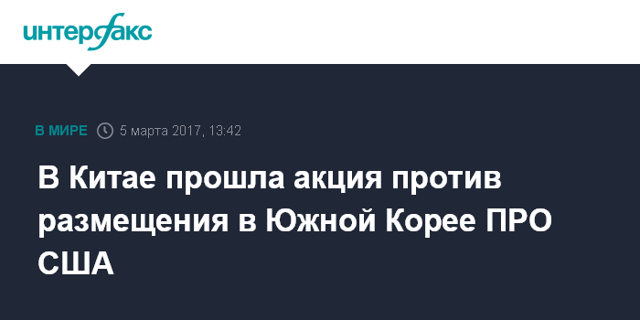 Москва. 5 марта. INTERFAX.RU - Жители северо-восточной китайской провинции Цзилинь провели в воскресенье демонстрацию протеста против размещения в Южной Корее американской противоракетной системы THAAD, сообщают СМИ с места события.