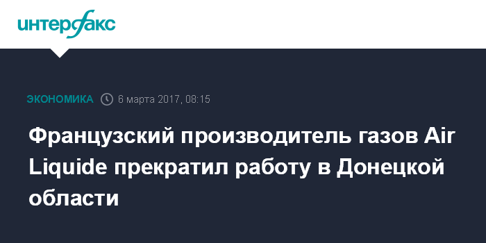 Москва. 6 марта. INTERFAX.RU - Французская компания Air Liquide, один из мировых лидеров на рынке промышленных газов, заявила о прекращении работы в Донбассе на неконтролируемых украинскими властями территориях, где у нее расположено дочернее ПАО "Эр Ликид Енакиево" (Донецкая область). На такой шаг компания пошла в связи с решением властей самопровозглашенной Донецкой народной республики о введении временных администраций на предприятиях под украинской юрисдикцией.