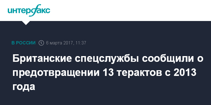 Москва. 6 марта. INTERFAX.RU - Британские службы безопасности сообщили, что им удалось предотвратить 13 потенциальных террористических атак с середины 2013 года, сообщает в понедельник британская "Би-Би-Си".