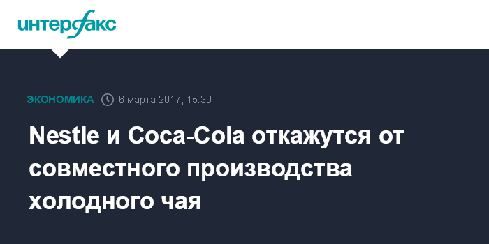 Москва. 6 марта. INTERFAX.RU - Один из крупнейших в мире производителей продуктов питания швейцарская компания Nestle и ведущий мировой производитель безалкогольных напитков американская Coca-Cola приняли решение об окончании деятельности совместного предприятия Beverage Partners Worldwide (BPW) в 2018 году.