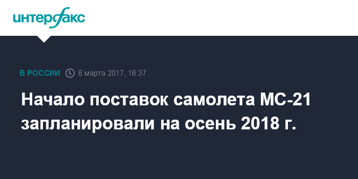 Москва. 6 марта. INTERFAX.RU - Поставка магистральных самолетов МС-21 планируется на осень 2018 года, сообщил вице-премьер Дмитрий Рогозин в ходе Авиационной коллегии при правительстве РФ.
