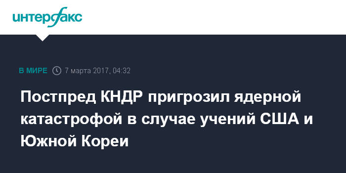 Москва. 7 марта. INTERFAX.RU - Совместные американо-южнокорейские военные учения в районе Корейского полуострова могут привести к ядерной катастрофе, заявил постоянный представитель КНДР при ООН Ча Сон Нам. В своем письме в Совет безопасности ООН он отметил, что США в ходе учений используют атомные авианосцы и подводные лодки и бомбардировщики, способные нести ядерное оружие.