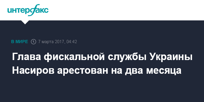 Москва. 7 марта. INTERFAX.RU - Суд в Киеве принял решение о назначении отстраненному от исполнения обязанностей главе Государственной фискальной службы Украины Роману Насирову меры пресечения в виде двух месяцев ареста.