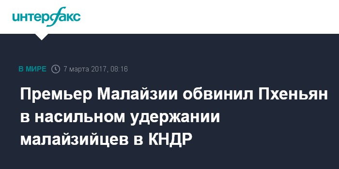 Москва. 7 марта. INTERFAX.RU - Малайзийский премьер Наджиб Тун Разак заявил, что власти Северной Кореи удерживают на своей территории граждан Малайзии в качестве заложников.